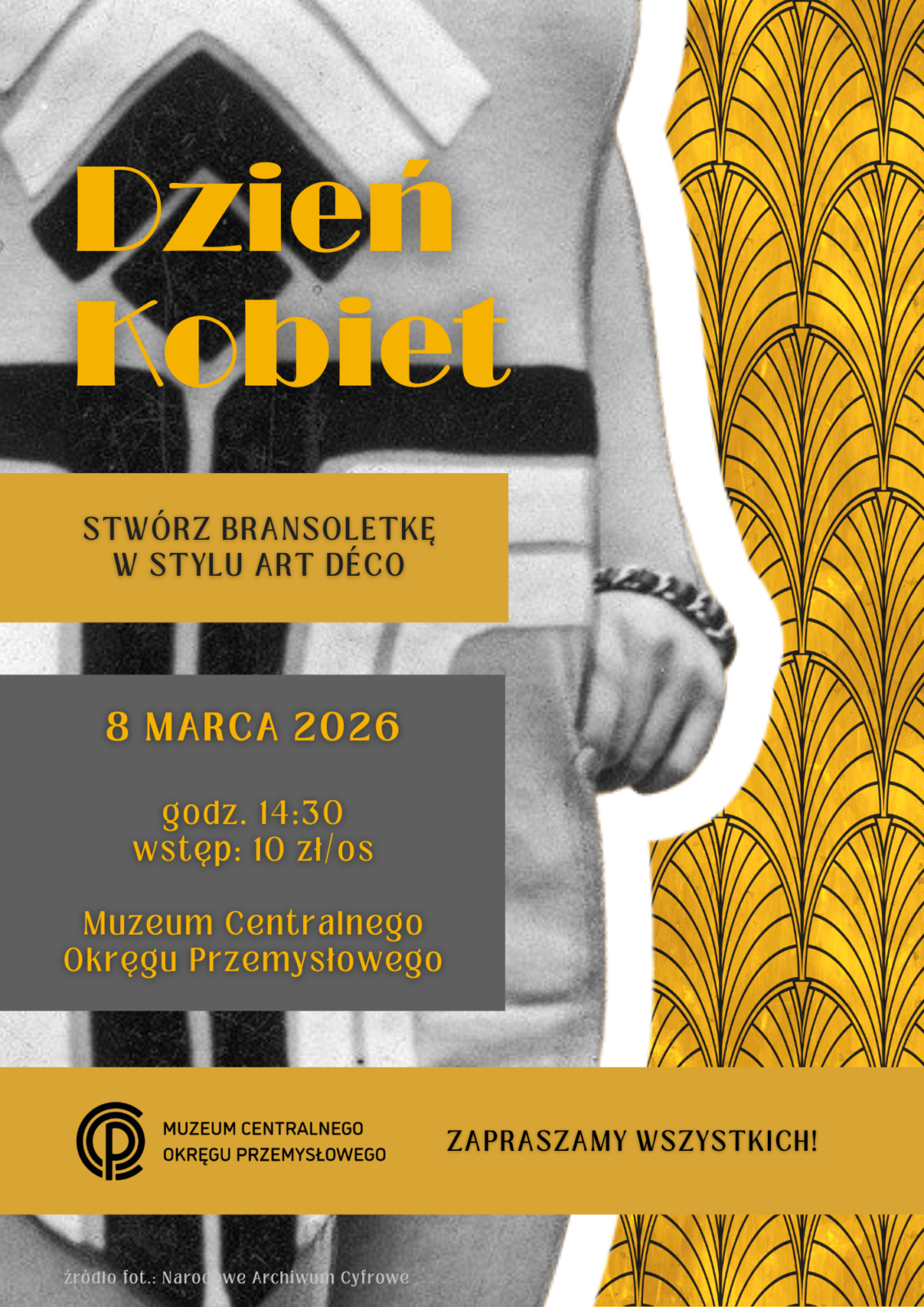 Z okazji Dnia Kobiet zapraszamy wszystkie Panie wraz z bliskimi do wspólnego świętowania w naszym Muzeum. Przygotowaliśmy wyjątkowe warsztaty biżuteryjne, które pozwolą uczestnikom zanurzyć się w atmosferze dwudziestolecia międzywojennego.